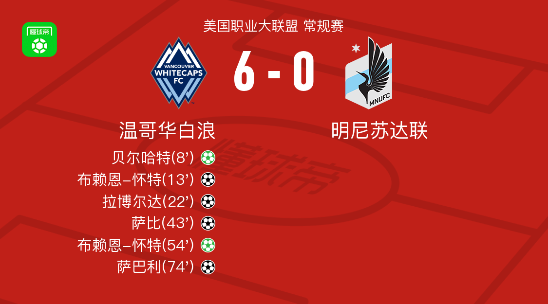北京时间3月16日美国职业大联盟 常规赛,温哥华白浪主场对阵明尼苏达联。温哥华白浪贝尔哈特破门,布赖恩-怀特梅开二度,拉博尔达破门,萨比破门,萨巴利破门。最终比分温哥华白浪 6-0 明尼苏达联。